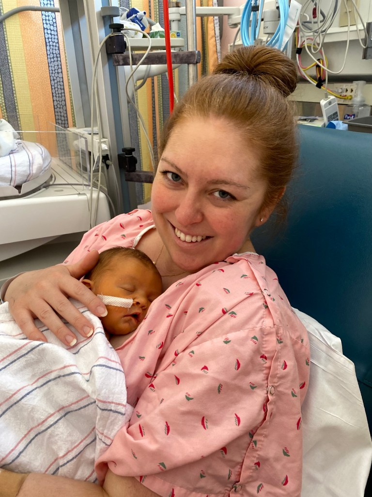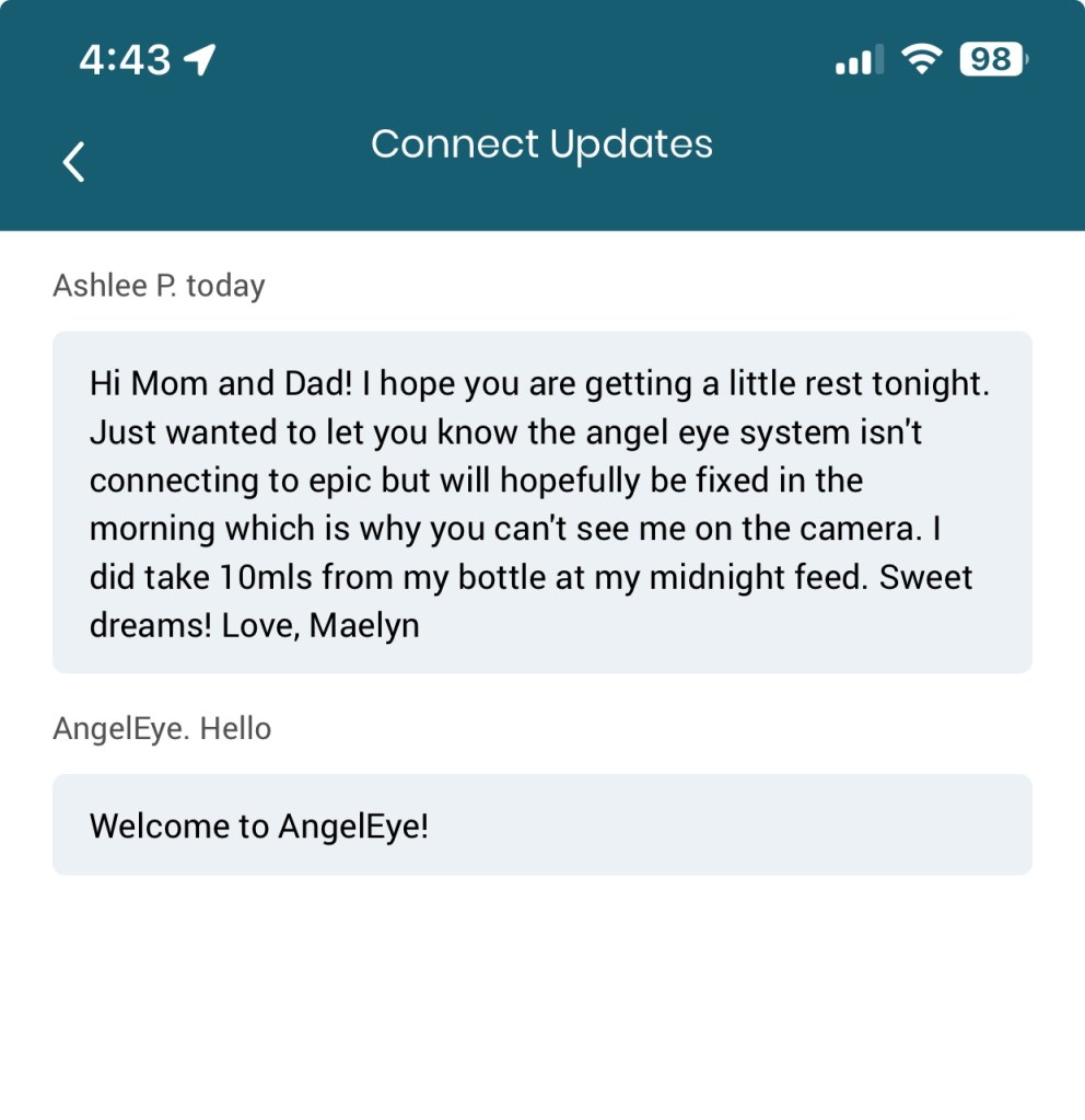 We went home last night after discharge for about 2 hours, unloaded, and I pumped, got a super quick shower and we got back to the hospital to spend a few hours with her til around midnight. I lost it when we left— but she is in such good care. The camera system that they have on her which we are supposed to be able to view at any time from our phones isn’t currently working. 😢 got a message in the middle of the night from her nurse!