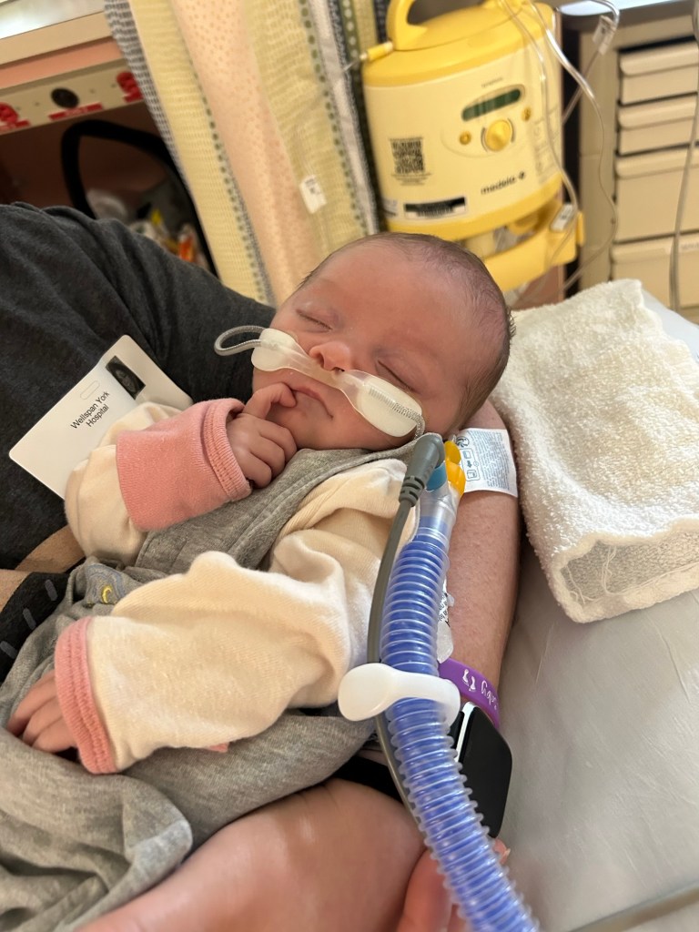 On Friday we met with the Dr. and he was in agreement with the plan to administer caffeine and mentioned that we would be discussing possible discharge early this week depending on how she does. He also stated that we would likely be sent home with a prescription for caffeine and also a small pulse ox monitor to continue to be able to monitor Maelyn’s oxygen saturations at home for some time until her pediatrician felt it was ok to come off everything.